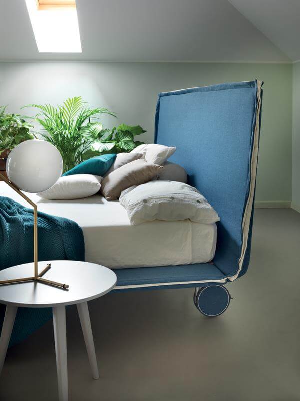 Letto matrimoniale MILA Light tessuto volant doppio ruote BLU
