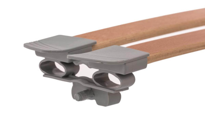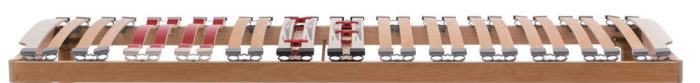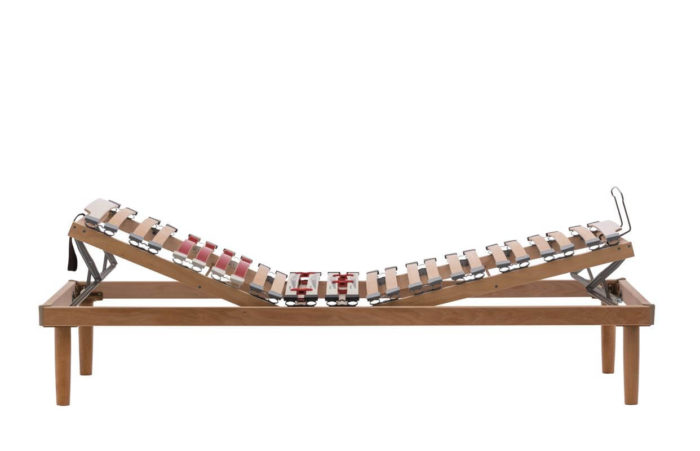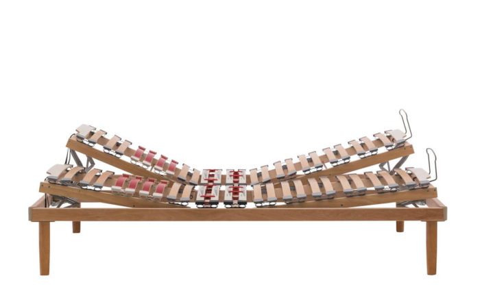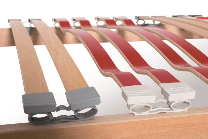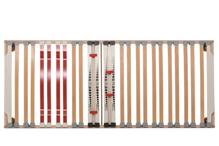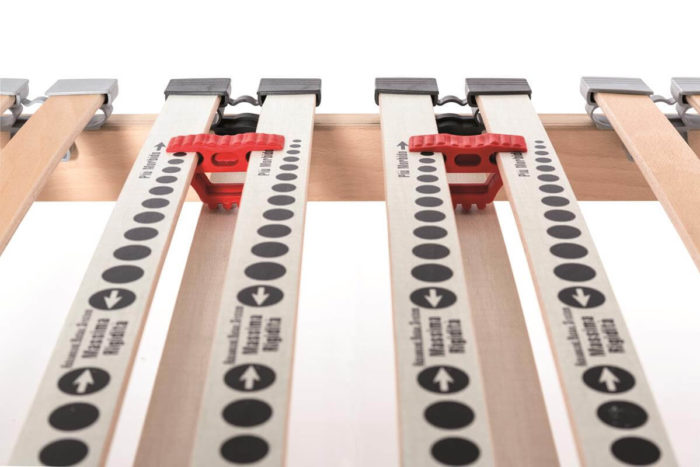 La zona delle spalle che necessità di un supporto più flessibile ed meno rigido, monta doghe ad ala di gabbiano con pellicola melaminica rossa; la zona del bacino, che richiede invece un maggior supporto, è dotata di regolatori di rigidità facili da manovrare (di colore bianco). Altre doghe terminali sagomate di colore bianco sono poste ai due estremi della rete.